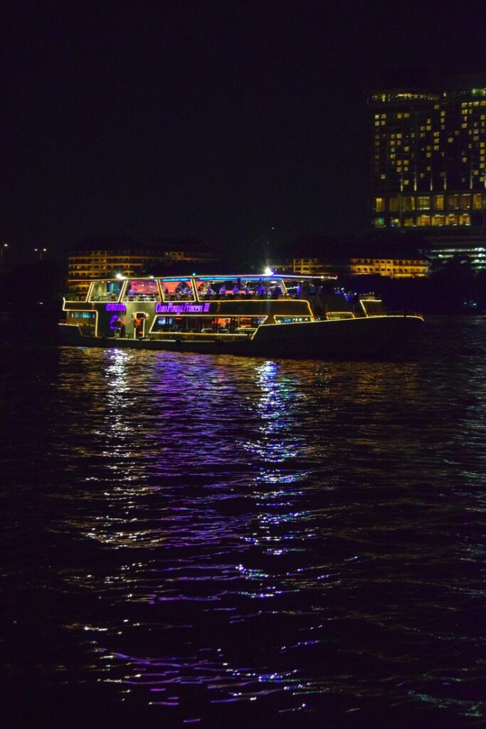 The Chao Phraya Dinner Cruise offers a calm evening on Bangkok’s famous river. As the boat moves along the water, you enjoy a warm buffet, soft music and views of temples and city lights. It’s a relaxing way to see Bangkok’s landmarks while enjoying good food and a peaceful night atmosphere.